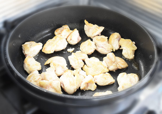 2.鍋(またはフライパン)にごま油(またはサラダ油)を入れ、鶏肉を中火で炒める。