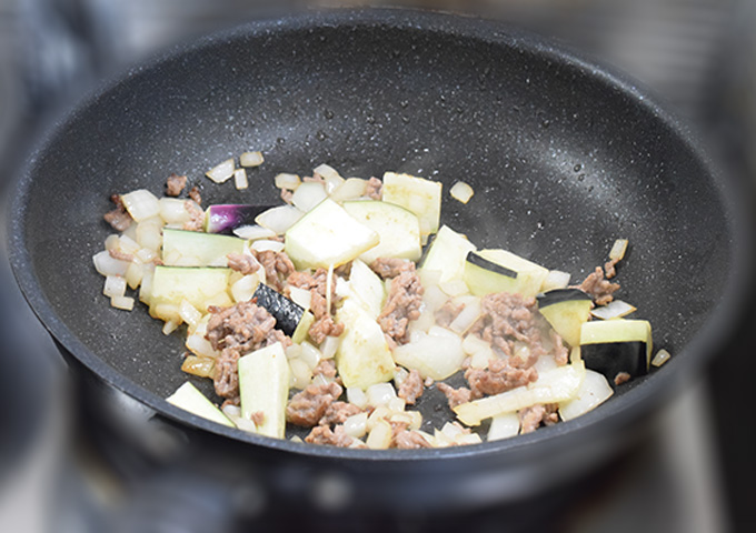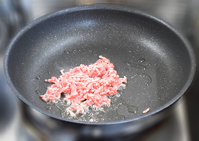 2.フライパンにサラダ油(分量外)を入れ、中火でミンチを炒める。