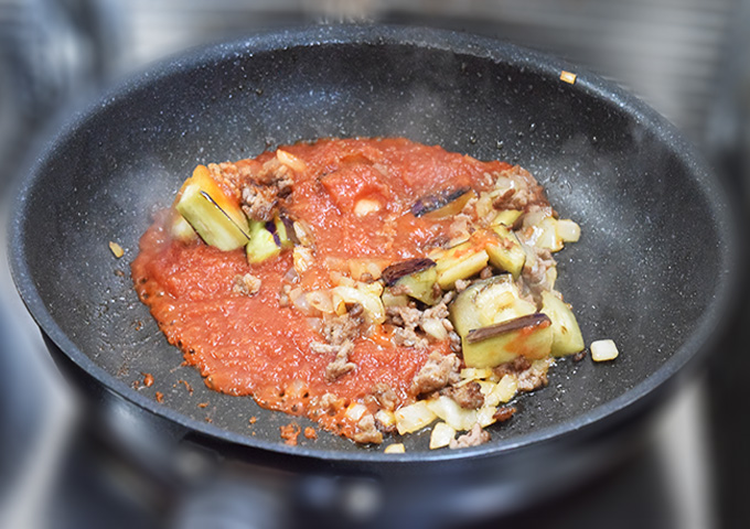 5.カットトマトを加えて全体を混ぜ合わせ、5分ほど煮込む。