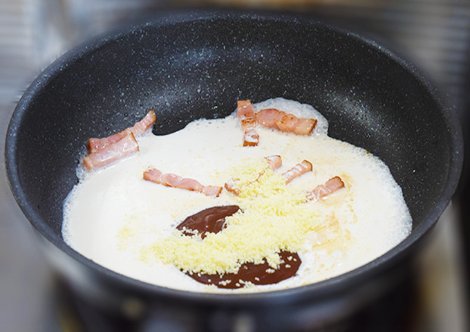 3.焼き目がついたら生クリーム、たれ、粉チーズを加えて混ぜ合わせる。