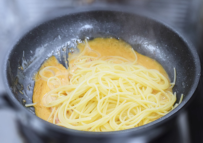 4.チーズが溶けたら茹でたパスタを加え、ソースを全体に絡める。