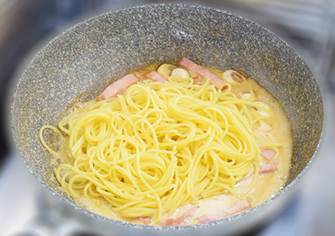 5.茹でたパスタを加えたらソースを絡めるように混ぜ合わせる。