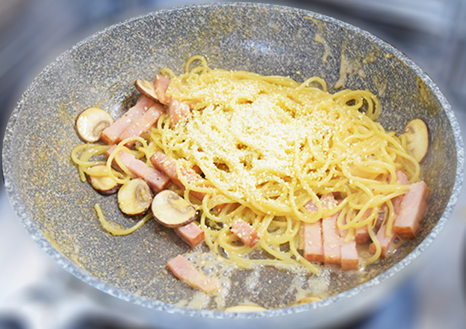 6.粉チーズを入れて全体を軽く混ぜ合わせたら器に盛り、卵黄を載せ、仕上げに黒こしょうをかけたら出来上がり。