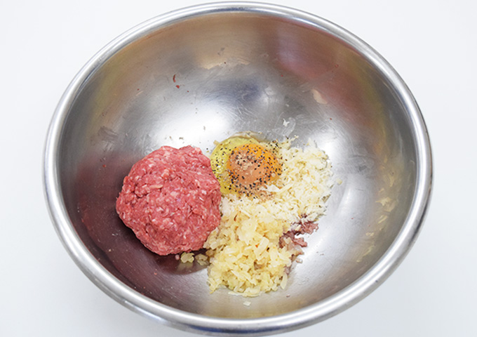 4.ナツメグ、ブラックペッパー、パン粉、たまご、②のソテーしたたまねぎを加え、よく混ぜ合わせたら2等分にする。