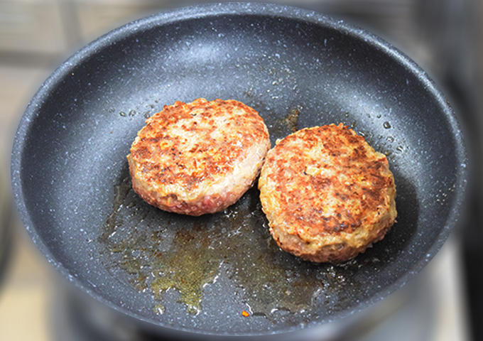 5.形を整え、片側中央に軽くくぼみを作り、平たい方を下にして、フライパンで中火にして焼き始める。