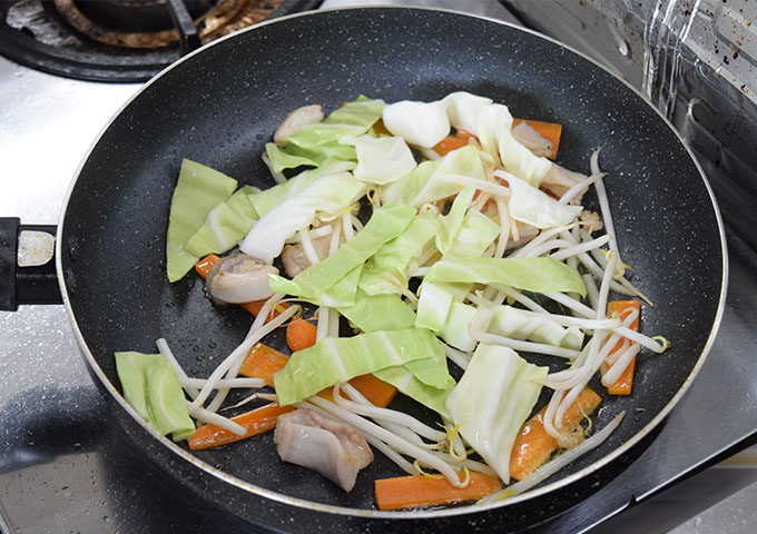 2.フライパンに大さじ1の油(分量外)を入れ、ホルモン、にんじん、もやし・・・のように火の通りにくい順に炒める。