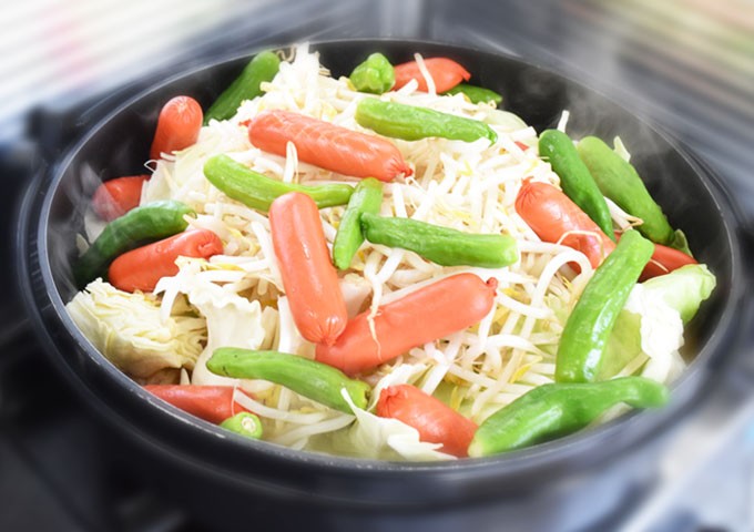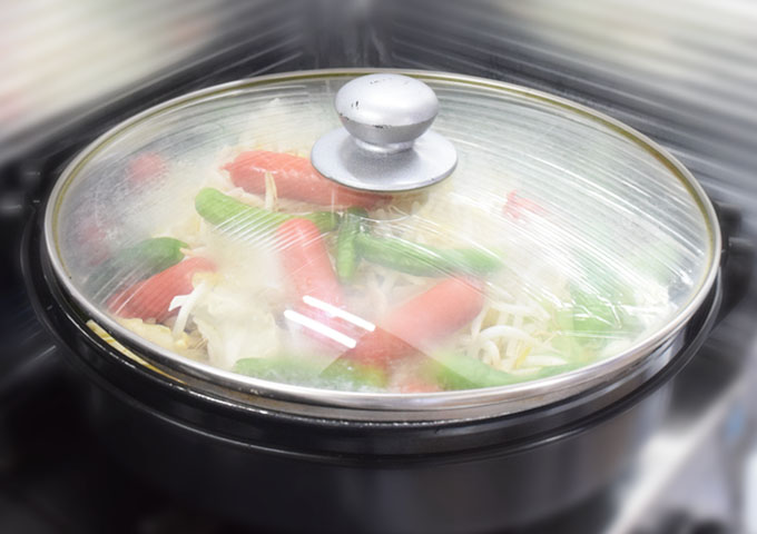 4.キャベツ、もやし、ししとう、赤ウインナーを加え蓋をして煮込む。