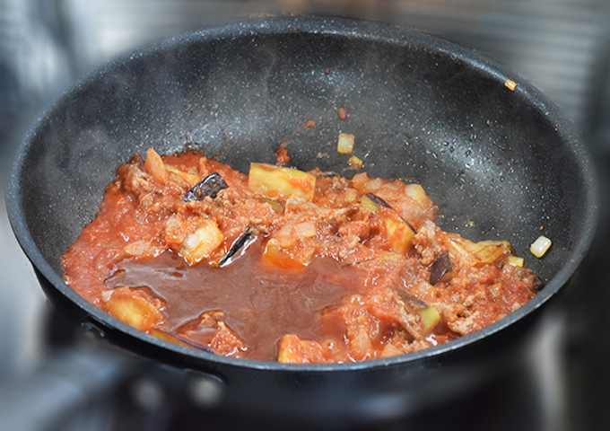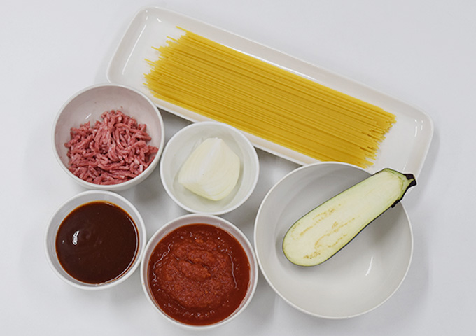 赤から焼肉のたれと相性抜群のトマトソースに、なすとミンチを合わせたピリ辛ミートソースパスタがご家庭で簡単に出来ます!
