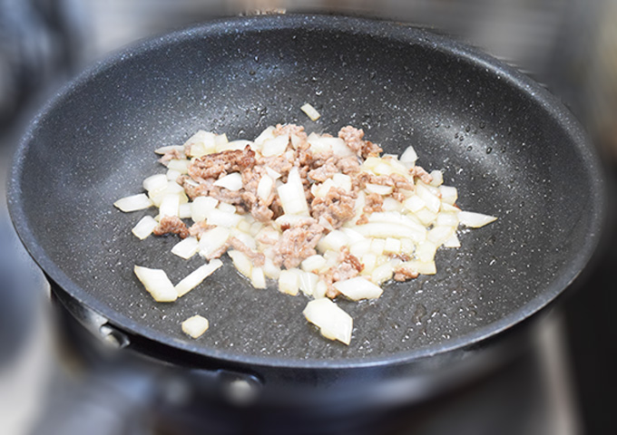 2.フライパンにサラダ油(分量外)を入れ、中火でミンチを炒める。