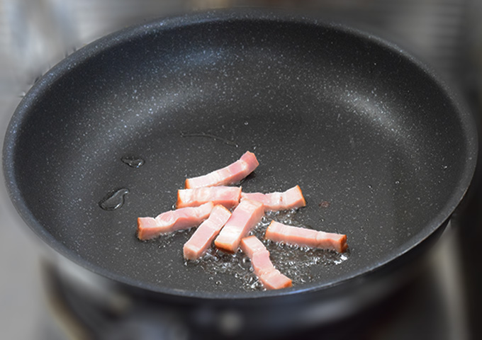2.フライパンを中火にあたため、ベーコンを炒める。