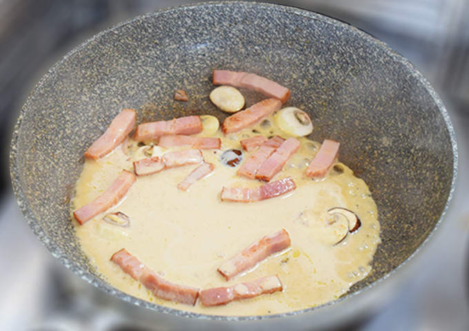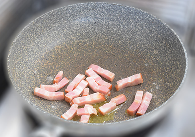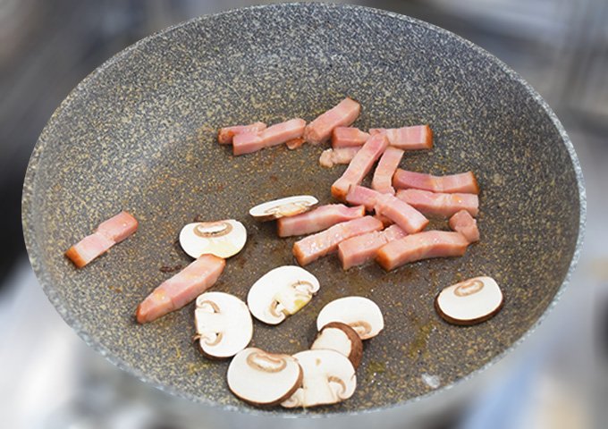 3.別のフライパンでベーコンを炒めたら、スライスしたマッシュルームを加え、しんなりするまで中火で炒める。