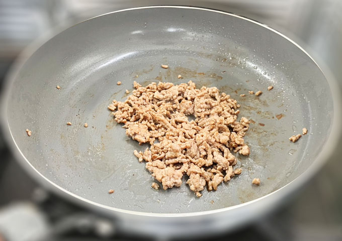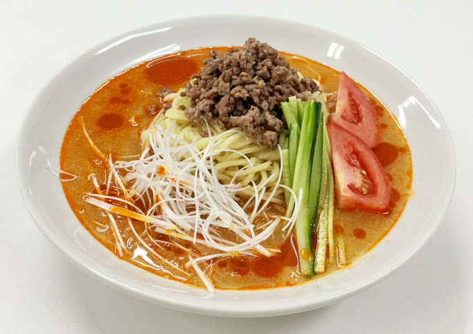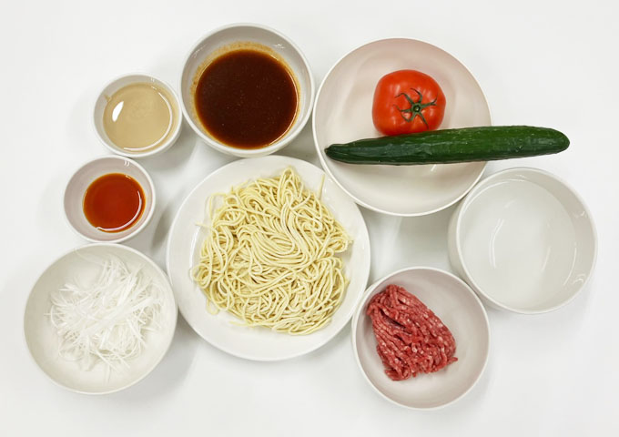 4.麺を茹で、氷水でしっかり締めたら器に盛り、③を注いだら、ミンチと野菜を盛り付けて完成。