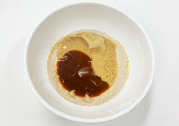 3.器にたれ、ねりごま、豆乳(または水)を入れてよく混ぜる。