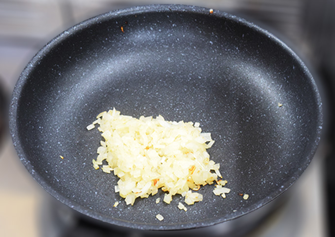 2.たまねぎをみじん切りにし、サラダ油(分量外)を引いたフライパンをあたため、中火でしんなりするまで炒めたら一旦器に取り出し冷ましておく。