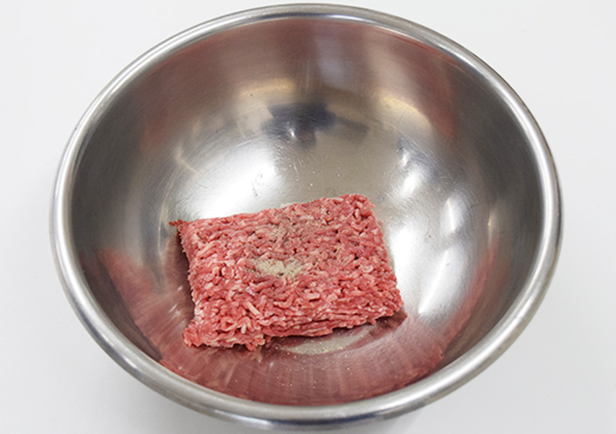3.大きめのボウルにミンチと塩こしょうを入れ、粘り気が出るまでよくこねる。