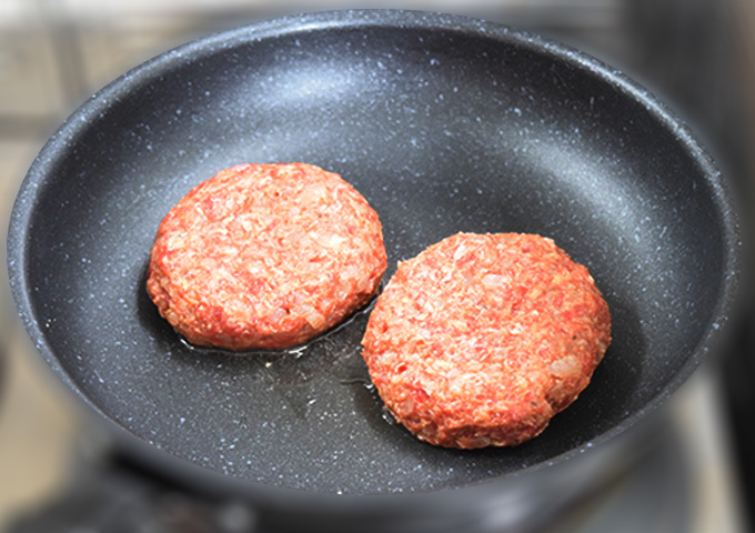5.形を整え、片側中央に軽くくぼみを作り、平たい方を下にして、フライパンで中火にして焼き始める。
